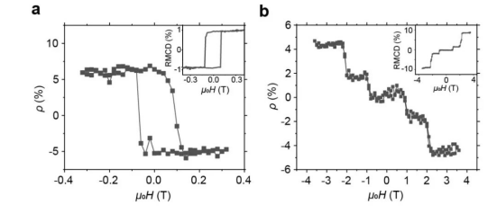 a.单层CrI3旋光性探测器的光响应偏振度随磁场的变化(内插图为单层CrI3的RMCD谱,表明其具有铁磁性);b.多层CrI3旋光性探测器的光响应偏振度随磁场的变化(内插图为多层CrI3的RMCD谱,表明其具有反铁磁性)