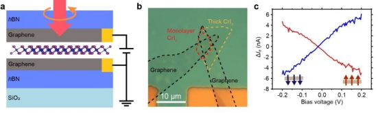 a.旋光性探测器结构示意图;b.单层CrI3旋光性探测器光学照片;c.不同磁化状态的单层CrI3在左旋、右旋圆偏振光照下的光电流之差,其中红色和蓝色分别表示向上和向下磁化的CrI3