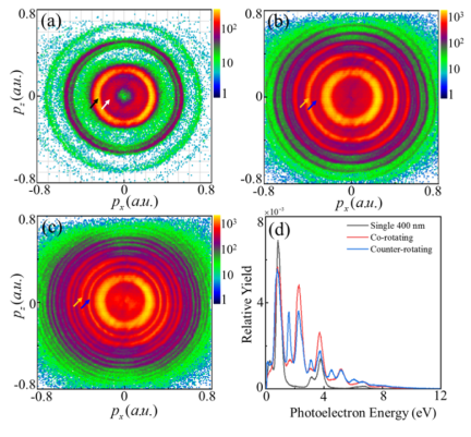 图1单色圆偏(a)、双色同向旋(b)、双色反向旋(c)圆偏光场中的光电子动量分布及相应的电子能谱(d)