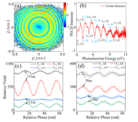 图2 动量分辨(a)、能量分辨(b)的圆二向色性谱,以及双色同向旋(c)、反向旋(d)圆偏时测量到2P3/2和2P1/2的自旋-轨道引起的光电离延时