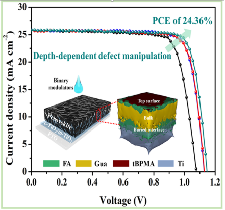 中心朱瑞研究员和龚旗煌院士课题组前期对钙钛矿“埋底”界面已进行较为深入的研究,近期,课题组基于已有认知,根据多晶钙钛矿薄膜内缺陷调控分子渗透特性的差异,创新地开发了一种“深度依赖”的缺陷综合调控策略。该策略可以利用双元钝化材料体系一步法实现不同空间维度缺陷的综合调控:一种不含苯环的缺陷调控分子(胍氢碘酸盐,GuaI)可以穿透钙钛矿的体相到达埋底界面,实现体相和埋底界面缺陷的协同钝化;而另外一个含苯环的分子(4-叔丁基苯甲胺氢碘酸盐,tBPMAI)可锚定在钙钛矿薄膜的表面,从而有效调控表面缺陷。这种“深度依赖”的缺陷调控策略可以同时钝化钙钛矿薄膜中的体相缺陷和界面缺陷,从而实现器件缺陷的综合协同调控。结果表明,经过处理后,钙钛矿薄膜的非辐射能量损耗得到显著抑制,相应的正式结构钙钛矿太阳能电池光电转换效率从21.79%提高到24.36%。并且该策略具有一定普适性,可被拓展应用于其它双元钝化材料体系上。该工作为高效钙钛矿光电器件的缺陷调控开辟了一条新途径。