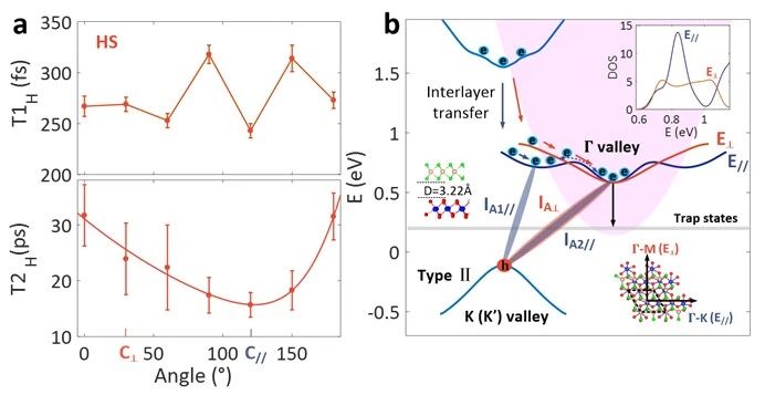 图3:(a) 超快电子弛豫寿命的极化依赖。(b) 光激发下电子的层间转移和各向异性间接层间激子态的形成。